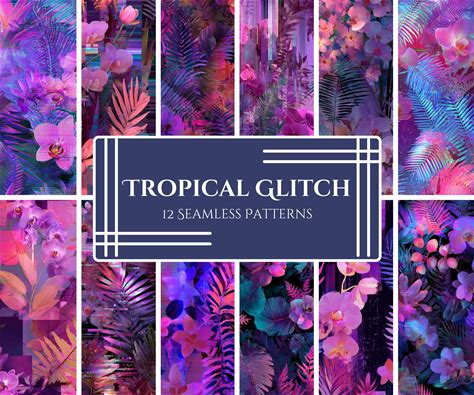 Neon Glitch Tropical Pattern Pack: Vaporwave Floral PNG (Digital Download)