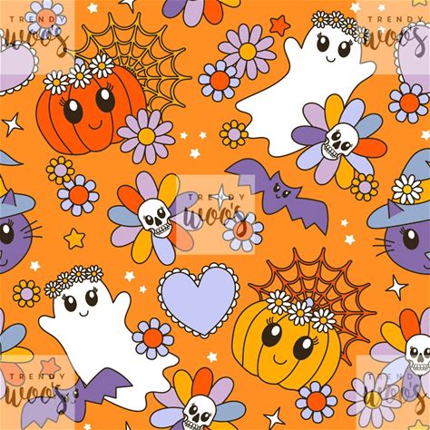 Halloween Cottagecore Cute Floral Hippie 70S Pumpkin Ghost Orange Seamless Pattern / Fabric Design / Surface Pattern / Digital Pattern